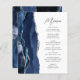 Le bord gauche de cet élégant menu mariage moderne présente une aquarelle bleu marine ornée d'une parties scintillant en faux argent. Le texte personnalisable combine le script d'écriture manuscrite gris charbon et les polices sans serif sur un arrière - plan blanc. La conception de l'agate bleu marine et argent est répétée à l'envers.