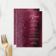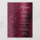 Cet élégant menu mariage moderne présente une bordure en faux diamant de parties scintillant sur un arrière - plan en métal brossé en faux bordeaux. Le texte personnalisable combine écriture manuscrite blanche et polices sans serif. La conception du métal brossé bordeaux et de la parties scintillant est répétée à l'envers.