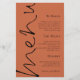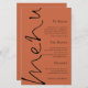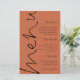 Un prix de taille budget 5.5" x 8.5", Ce design contemporain en terre cuite a Menu dans un élégant script défini en tournant à gauche et le reste du texte est aligné à droite que vous pouvez facilement personnaliser ainsi que vos noms et date mariage au dos. Les couleurs texte et arrière - plan de chaque côté peuvent être changées à n'importe quel de votre choix via l'option customiser plus loin.