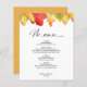 Célébrez votre mariage d'automne dans le style sans compromettre votre budget avec ce Budget Fall Leaves Mariage Menu. Doté d'illustrations charmantes de feuillage d'automne aux tons chauds, ce design de menu saisit la beauté confortable et rustique de la saison tout en offrant un moyen abordable d'élever vos tables de réception. La mise en page facile à lire dresse une liste élégante de chaque cours, ajoutant une touche attentive qui guide les clients dans l'expérience de dîner. C’est la solution idéale pour les couples qui cherchent à créer un look cohésif et saisonnier sans surdépenser.