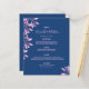 Une carte à la mariage à la fois élégante et tendance. Personnalisez et ajoutez vos noms, votre date et le menu mariage. Arrière - plan bleu décoré de sprigs botaniques roses et de feuillage. Vos noms sont écrits avec un script de style moderne écrit à la main. Retour : arrière - plan bleu.