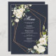 Moderne et tendance, ce menu mariage présente une géométrie en faux cuivre agrémentée d'une aquarelle blanche fleurie et d'arrangements floraux d'eucalyptus, sur une texture bleu marine moderne. Copyright Invitations élégants. Tous droits réservés.