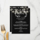 Doté de jolies lampes à cordes et d'illustrations artisanales à fleurs rustiques, personnalisez ce menu noir et blanc élégant avec vos informations spéciales sur le menu du jour de mariage. Conçu par Thisisnotme©