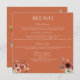 Donnez le ton à votre réception avec ce menu mariage à fleurs en terre cuite, avec des fleurs d'aquarelle romantiques et une typographie élégante. Le riche arrière - plan en terre cuite ajoute chaleur et sophistication, parfait pour les thèmes automne, boho, rustique ou mariage moderne. Ce format de carte carré ajoute une touche unique et élevée à vos paramètres de place. Customisez facilement les choix de repas pour refléter votre journée spéciale. S'accorde à merveille avec les invitations florales en terre cuite assorties, les cartes RSVP et la signalisation de table pour une suite mariage cohésive.