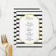 Menu dîner mariage dans élégante rayures noir et blanc motif et détails or, personnalisable avec vos détails et disponible en produits mariages correspondants.