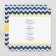Menu mariage dîner dans élégant bleu marine foncé, jaune citron clair et blanc avec motif rétro chevron zigzags, personnalisable avec vos détails et disponible en produits mariages correspondants.