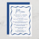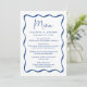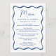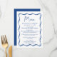 Ajoutez une touche vintage à votre soirée de fiançailles, à votre dîner de répétition ou à votre réception de mariage avec ce menu de mariage moderne Blue Wavy Frame. Le design affiche les noms du couple, la date du mariage et les options de menu en lettres bleues en gras entourées d'une bordure bleue ondulée contre un arrière - plan blanc. Le menu rétro mariage est coordonné avec notre collection de mariages Modern Wavy Frame.