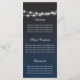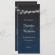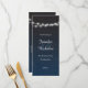 Un élégant menu moderne modèle à la réception de mariage dans une aquarelle bleu marine à l'effet ombre avec des touches de brosse. En haut du menu se trouvent deux cordes de lumières scintillantes dont l'arrière - plan sert de faux ciel nocturne.