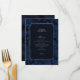 Elégant menu de réception de mariage dans un style plus formel avec une disposition classique de cadres en or et de texte avec une bordure en cachemire ornée. Cet exemple ajoute une touche moderne avec son arrière - plan en bleu marine chatoyant. Ajoutez les détails de votre événement dans une police serif pour son attrait traditionnel.Le menu affiché ici comporte également un modèle pour ajouter facilement vos sélections de menu, vos initiales et votre date de mariage. Recherchez ID767 pour voir d'autres choix de couleurs pour cette conception.