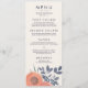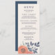 Placez ces élégantes cartes de menu à chaque endroit pour une touche de beauté à votre accueil de mariage. Design floral moderne dans une palette de couleurs chic corail et marine dispose de fleurs de coquelicot aquarelle dans la pêche corallienne, avec feuilles et bourgeons dans bleu marine poussiéreux et vert chasseur défraîchi. Ajoutez vos noms et votre date de mariage en haut. Coordonner avec notre collection de faire-part de mariage Peach Poppies. Utilisez les champs modèle pour ajouter les informations de votre menu, puis cliquez sur "Customiser" pour repositionner les éléments si nécessaire. Besoin d'aide ? Contactez-moi via le lien "Demandez à ce concepteur" sur cette page.