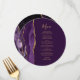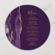 Le bord gauche de cet élégant menu mariage moderne rond présente une bordure d'aquarelle violette ornée d'une parties scintillant en faux or. Le texte personnalisable combine écriture manuscrite couleur or et polices de cuivre sur un riche arrière - plan de prune. L'envers est assorti d'une agate violette et dorée.