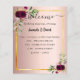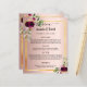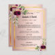 Un élégant menu mariage de style bohème et un programme en soirée. Plumes et roses luxuriants en bordeaux. Modèles pour vos noms, date, menu mariage et programme. Un cadre en faux or et un arrière - plan chic rose en dégradé d'or.