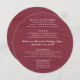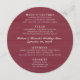 Menu mariage ronde avec un look bois rouge foncé. Le titre est au centre avec quatre sections pour lister les entrées / hors-d’oeuvre, salade, entrées et dessert ou tout autre mets qui sera servi à la réception ou le dîner de répétition. Chaque section peut contenir jusqu'à quatre lignes de texte. Couleur rouge bordeaux avec des titres blancs et un script central qui peut contenir les noms du couple, le titre du menu et la date de l’événement. Les éléments de menu sont en majuscules et en blanc imprimé. Afficher comme forme ronde ou choisir carré. Mises à niveau du papier proposées.