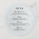 Menu mariage ronde pour une plage ou une mariage sur le thème de l'océan. Un dollar de sable grand et réaliste est l'arrière - plan du texte noir. L'Arrière - plan est d'un gris-bleu très pâle. Chaque section du menu est séparée par un titre. Les menus ronds s'adaptent bien sur les assiettes et celui-ci mesure 5 pouces de large.