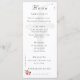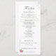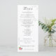 Design présente l'image faible d'un crucifix couleur argent contre blanc pur en tant qu'arrière - plan à votre texte personnalisable. Le format suit celui d'une carte de menu mariage traditionnelle. L'image d'une rose rose grace le coin inférieur gauche. Les noms de la mariée et de la mariée ainsi que la date du mariage sont affichés à l'envers en bas. Conçu pour coordonner avec la "Suite Mariage catholique Rose nuptiale". Tout le texte est dans une police de couleur argent.