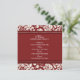 Menu dîner mariage dans élégant rouge et crème blanc classique motif damassé floral, personnalisable avec vos détails et disponible en produits mariages assortis.