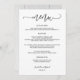 Tourbillonnant Bouncy Calligraphy Mariage Menu (noir et blanc) : Ce beau menu mariage présente un script de calligraphie noir tourbillonnant et rebondissant en haut. Le dos a une texture en bois que vous pouvez faire pivoter, changer la couleur de base ou supprimer totalement si vous le souhaitez. Modifiez le texte et les noms en bas. Faites-le parfait pour votre jour de mariage !