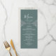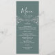 Elégant, moderne, boho, vintage menu mariage sauge vert avec coeur de corde argentée et dentelle dorée fleurie.