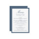This wedding menu features “Menu” in flowing navy calligraphy, with the couple’s names, wedding date, and dining selections arranged below in classic serif type. The navy border frames the layout with a crisp, tailored feel that suits traditional, coastal, and formal weddings. The structured design and rich color palette create a refined presentation for your reception courses and place settings.