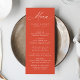 Éclaircissez votre réception de mariage avec ce menu mariage époustouflant, avec "Menu" en calligraphie blanche élégante sur un arrière - plan verona sunset-orange vibrant. Ce design moderne, simple et élégant permet aux couples de personnaliser leur menu avec leur nom, leur date de mariage et leurs détails de repas en caractères blancs gras. Parfait pour les mariages de toutes les saisons, ce menu complète les célébrations décontractées et formelles, ajoutant une pop de couleur et de sophistication à votre réception. Que vous soyez en train d'organiser un rassemblement intime ou un grand événement, ce menu mariage élégant impressionne vos invités et améliore l'expérience culinaire.