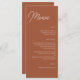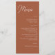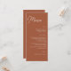 Ce menu de la réception en terre cuite orangée mariage de automne est parfait pour un mariage de style bohème. Cette palette de couleurs tendance est parfaite pour un mariage de fin d'été ou d'automne. Faites de ce menu votre propre en incluant tous les détails du menu de la réception de mariage. Faites-les imprimer ou choisissez un téléchargement numérique pour imprimer vous-même.