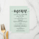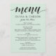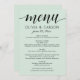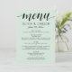 Les cartes de menu modernes et chic bleu menthe bleu mariage présentent un design typographique noir élégant avec des accents de script de calligraphie audacieux et un texte personnalisé élégant qui peut être personnalisé avec vos délicieux détails du menu du dîner et un monogramme des noms de mariée et de mariée et la date de mariage.
