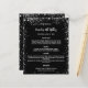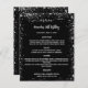 Un menu élégant et glamour. Un arrière - plan noir, décoré de faux parties scintillant argentées, brille. Texte blanc. Personnalisez et ajoutez votre nom, vos dates et le menu. Vous pouvez ajouter du texte, des photos à l'arrière. 1 feuille = 1 menu imprimé bord à bord.