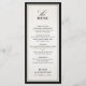 This old money inspired black and ivory wedding menu card features refined serif typography with an elegant script heading, framed by a bold black border for a timeless and distinguished presentation. The structured layout highlights each course in classic black tie style, creating a sophisticated and heirloom-inspired aesthetic.