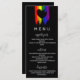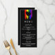 Charmant menu mariage lgbt avec drapeau de la fierté arc-en-ciel dessiné avec des touches désordonnées et orné d'un coeur noir contre un arrière - plan noir. Menu mariage gai en noir avec un coeur et des traits arc-en-ciel. Menu mariage lesbien avec un coeur sur les coups de pinceau de couleur arc-en-ciel.