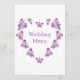 menu mariage papillon design coeur. Customisez ce menu couleur violet avec vos détails mariages. Si vous avez besoin d'aide pour vous customiser, contactez-nous via le lien de cette page. Menu mariage personnalisé avec conception de coeur de papillon violet