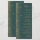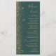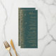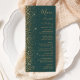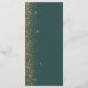 Le bord gauche de cet élégant menu mariage moderne présente un style de parties scintillant en faux or. Le texte personnalisable combine écriture manuscrite couleur or, cuivre et polices italiques sur un arrière - plan vert foncé. L'envers présente une parties scintillant verte et dorée assortie.