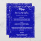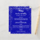 Un arrière - plan bleu royal. Texte blanc. Décoré de parties scintillant en faux argent, pétillant. Avant : Personnalisez et ajoutez votre nom, votre date et le menu. Retour : Programme. Si vous avez un grand programme, vous pouvez réduire l'espacement des lignes. 1 feuille = 1 menu imprimé bord à bord.