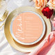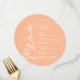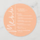 Une carte de menu de dîner rond pêche présente vos choix de menu en lettrage blanc chic, parfait pour une réception de mariage moderne, un dîner de répétition de mariage, une fête d'anniversaire ou tout événement spécial avec un dîner assis. Personnalisez facilement avec votre menu de dîner et vos détails. PLUS de couleurs dans notre magasin.