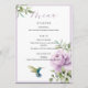Il s'agit d'une image simple et adorable, avec un rose violet aquarelle, des feuilles et un colibri vibrant contre un arrière - plan blanc avec une bordure mauve douce.