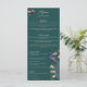 Ce menu mariage moderne et rustique présente des illustrations de style "Chinoiserie" dessinées à la main d'un paon bleu et turquoise entouré de verdure Magnolia, avec des fleurs de magnolia rose vif et crème vibrante, le tout contre un élégant arrière - plan vert turquoise foncé. Le dos est orné d'un élégant motif floral et ornithologique avec des illustrations coordonnées. Tout le texte est modifiable. Customisez avec vos coordonnées de mariage, y compris les noms de mariée et de mariée, apéritif, plat, table de desserts et boissons.