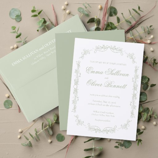 Inspired by classic garden weddings and natural forms, each detail is carefully illustrated to evoke refinement, simplicity, and quiet beauty. The sage green tones offer a versatile and enduring look that complements both formal and organic wedding styles.