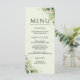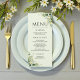 A sophisticated sage green lily of the valley wedding menu featuring elegant corner watercolor calla lilies and simple botanical greenery.