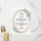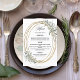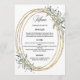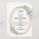 Un arrière - plan blanc. Un cadre ovale imitant l'or décoré de vert sage. Personnalisez et ajoutez vos noms, ainsi que le menu. Texte noir.