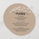 Script rustique moderne, en kraft marron, schéma de lumières à cordes, Menu Dîner Mariage. Une carte de menu parfaite pour votre grand jour. Vous pouvez modifier les couleurs de police du script et le contenu et les polices du menu pour répondre à vos besoins. Ce design peut être utilisé pour votre anniversaire, anniversaire et autres célébrations.