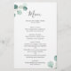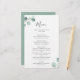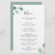 Menu de mariage élégant avec un design simple avec aquarelle peinte de la verdure d'eucalyptus dans le coin supérieur gauche et le coin inférieur droit. L'arrière est une teinte assortie de vert sage moyen. Ce menu botanique rustique mariage avec une touche moderne est parfait pour un mariage de printemps ou d'été et est imprimé sur une feuille plate pour une option économique.