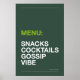 Brighten up your kitchen with humor! “MENU: SNACKS, COCKTAILS, GOSSIP & VIBES” poster in modern typography. Available in multiple color backgrounds, perfect as home decor, gifts, or kitchen wall art.