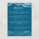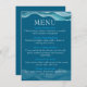 Apportez une touche d'élégance côtière à votre célébration avec ce design de menu artistique. Avec des vagues d'océan bleu peintes à la main à l'aquarelle, ce modèle est parfait pour les mariages sur la plage, les réceptions au bord de la mer, les fêtes d'été ou les événements sur le thème nautique. L'illustration de vagues sereines ajoute une esthétique fraîche et moderne, rendant votre menu non seulement pratique mais aussi une belle partie de votre décoration de table.