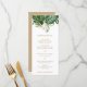 Menu mariage botanique moderne avec une bordure supérieure composée d'aquarelles peintes de verdure tropicale et de feuilles faux or. Ces élégants menus tropicaux à thème mariage sont parfaits pour un mariage d'été.