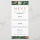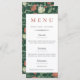 Accents décoratifs vintages et typographie moderne, carte de menu mariage élégante. Le menu est composé d'un motif de textile anglais ancien dans des tons élégants de rouge, vert et champagne. Conçu pour correspondre à notre collection de mariage de jardin anglais antique.