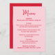 Share your reception menu in style with this whimsical wedding menu card designed to coordinate with modern and playful wedding stationery. The front of the menu features “Menu” displayed in a handwritten red script with your wedding menu details shown below on a pink background, making it a charming addition to place settings or reception tables. The back of the wedding menu card features a hand-drawn pink heart surrounding the couple’s names and wedding date for a cohesive and personalized look. Perfect for Valentine’s weddings, February weddings, and romantic celebrations, this customizable wedding reception menu adds personality while helping guests easily view the menu at your reception.
