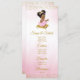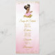 Menu Princess baby shower avec adorable jeune fille afro-américaine d'ethnie princesse portant une mignonne tenue rose et un chapelet de perles assis sur un joli coussin or sur un élégant arrière - plan rose et or. Ces menus de baby showers princesses mignons sont facilement customisés pour votre événement en ajoutant simplement vos détails dans le style de police et la disposition de votre choix.