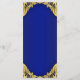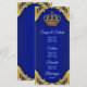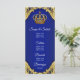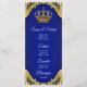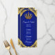 Menu de baby shower prince avec une belle couronne royale bleue et or sur un fond élégant à tourbillons bleus et or. Ces menus de baby shower prince bleu royal et or sont facilement personnalisables pour votre événement en ajoutant simplement vos détails dans le style de police et la mise en page que vous préférez.