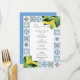 Cet élégant menu de 5x7 mariage est composé de citrons d'aquarelle dans les tons jaunes avec un motif de carreaux Amalfi dans les tons bleu et rouille. Le mot "Menu" est défini dans le script de calligraphie. Utilisez les champs modèle pour ajouter vos éléments de menu personnalisés. Parfait pour les mariages italiens et d'été, dîner de répétition, soirées de fiançailles et plus encore. Art unique et design de Victoria Grigaliunas de Do Tell A Belle