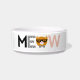 An adorable cat food bowl with the word meow and a cute orange cat with glasses and a bow tie.