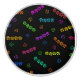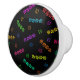 A pattern for cat lovers featuring the word "meow" written with a paw print font in a rainbow of colours on a black background. Cute, colourful kitty faces complete the design.